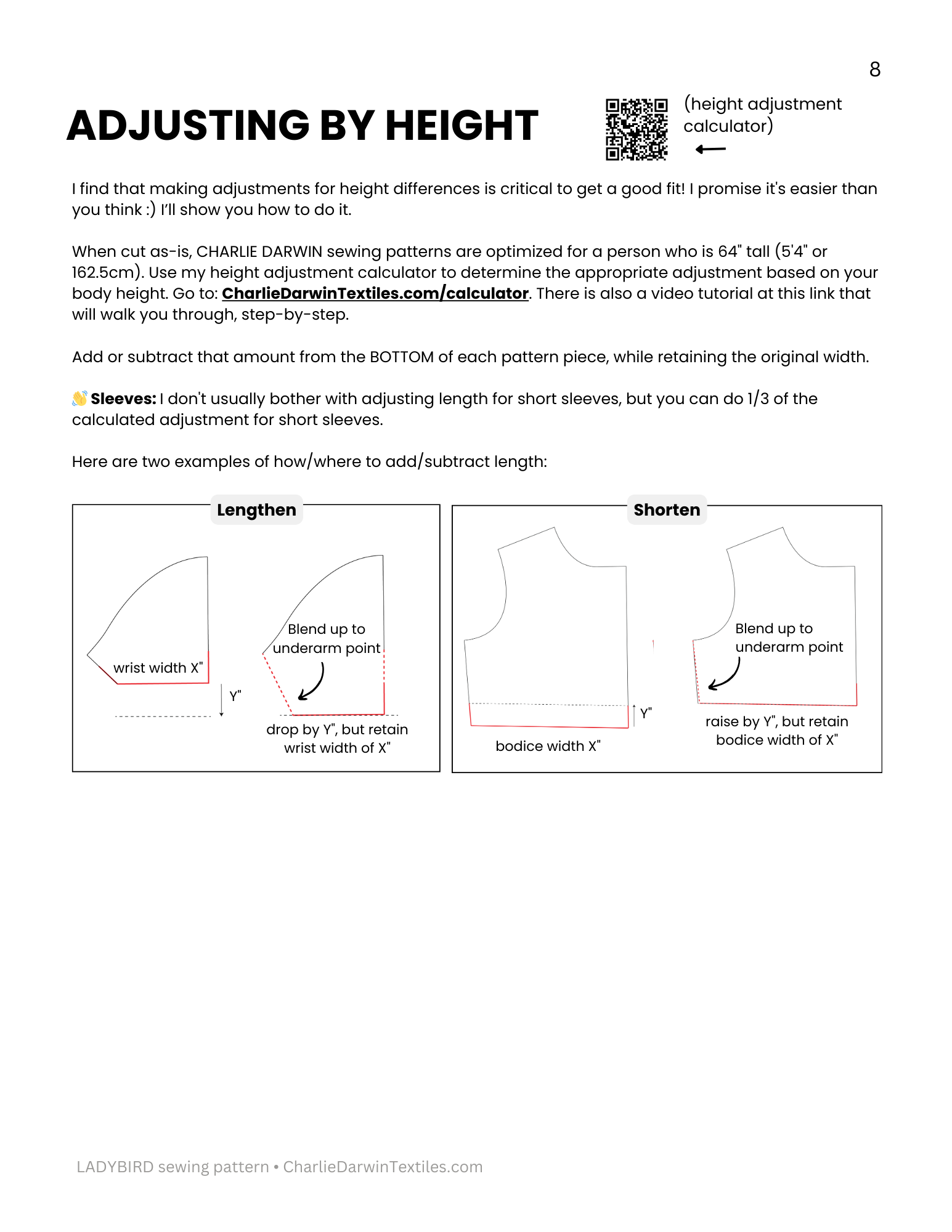 If you are not 64" (162.5cm) tall, use my Height Adjustment Calculator to know exactly how much to tailor each pattern piece. Then, I'll show you how/where to add or subtract that length on your pattern pieces.
