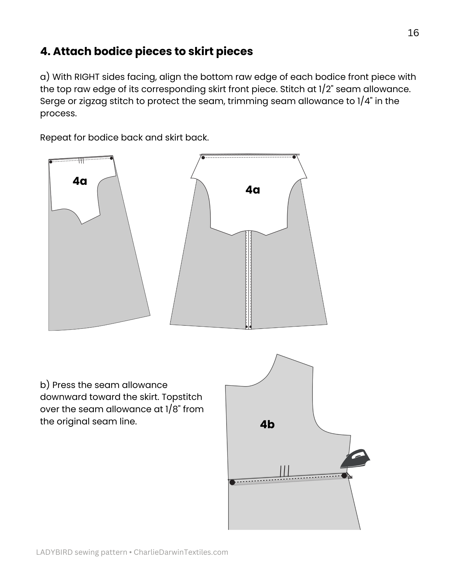 Stay-stitch your neckline Prepare the waist ties Skirt center back Bodice pleats Waist seam Center front edge Shoulder seam Collar Sleeves Pockets Side seams Hems Buttons
